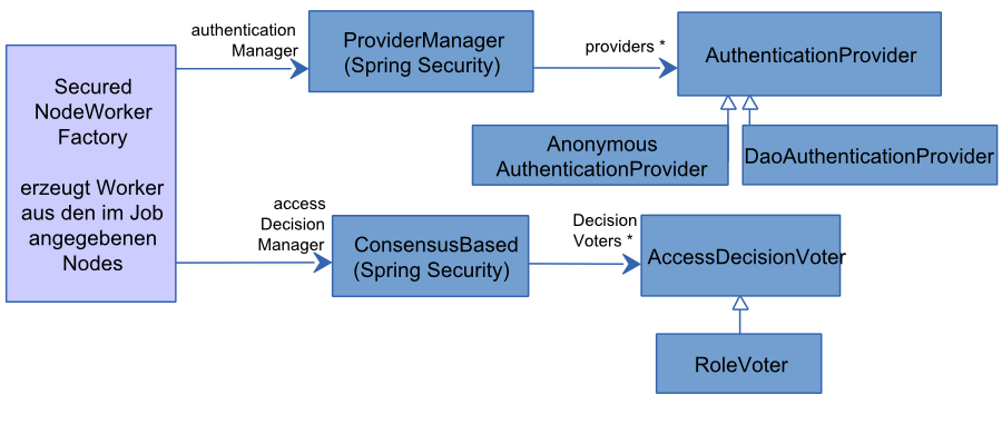 Zur Authentifikation und Gewährung von Rollen wird auf das Framework Spring Security zurückgegriffen. Das Zusammenspiel zwischen jadice server und Spring Security zeigt folgende Abbildung 8.1, „Zusammenhang zwischen jadice server und Spring Security“: